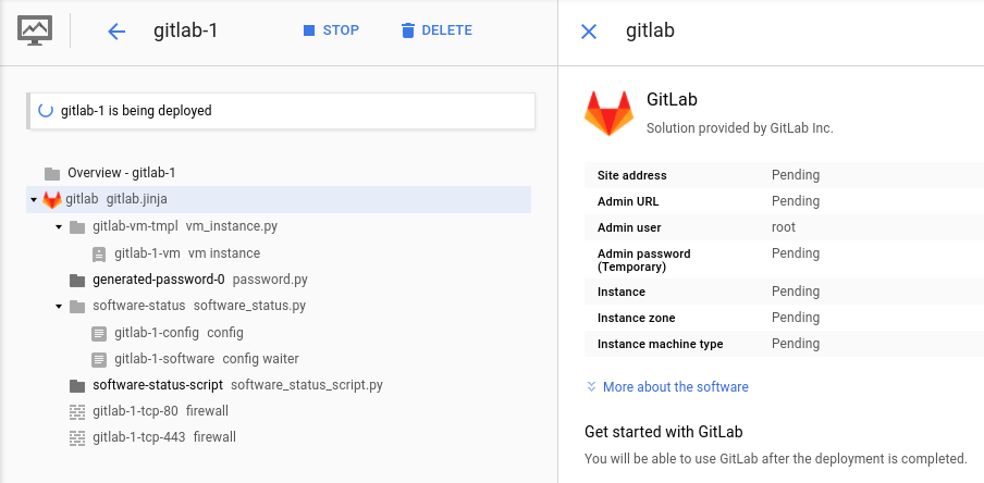 After a few seconds, GitLab will be successfully deployed and you should be able to see the IP address that Google assigned to the VM, as well as the credentials to the GitLab admin account.